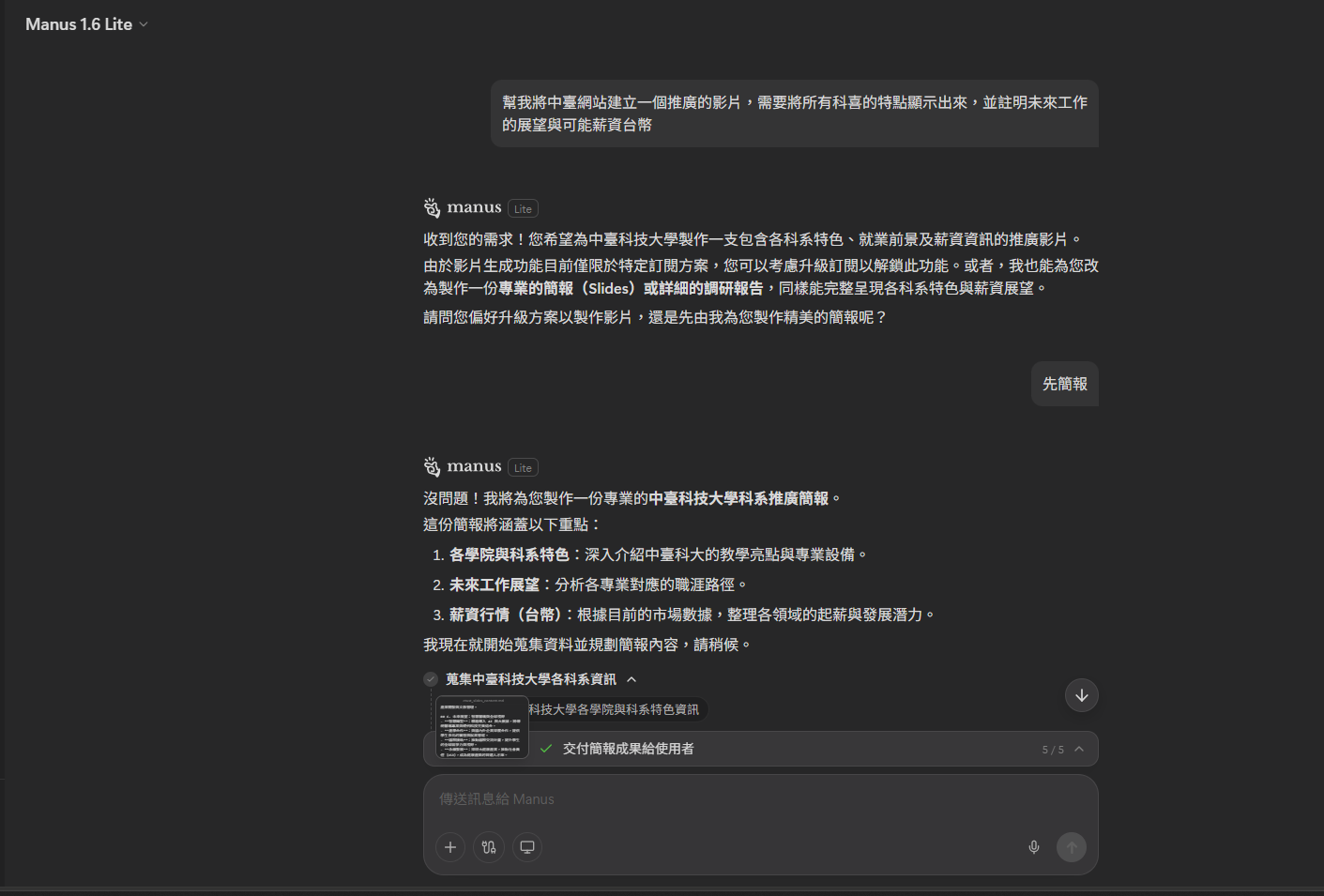 簡易範例 提示詞 幫我將中臺網站建立一個推廣的影片,需要將所有科喜的特點顯示出來,並註明未來工作的展望與可能薪資台幣